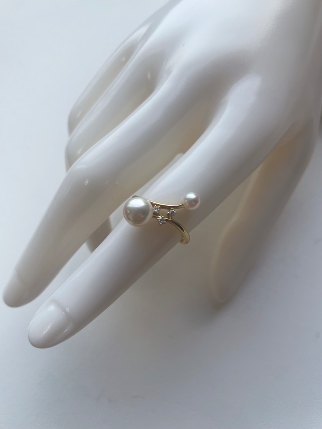 2粒のサイズ違いのアコヤ真珠が指先で上品に輝く、オープンデザインのリング。 存在感があり、手元にやさしいアクセントをプラスします。 パール好きな方への贈り物にもおすすめです。 真珠:アコヤ真珠 真珠サイズ:6-7.5mm ダイヤ:0.04ct リング素材:プラチナ リングサイズ:10号 商品画像はイメージです。真珠の特性上、若干の色味の違いがございます。真珠は生きている貝から生まれる宝石です。そのため無傷のものはほとんどありません。少しの傷などがある場合がありますが、それよりも当店は照り、光沢、輝きを1番に重視して選別し商品作成しております。予めご了承くださいませ。