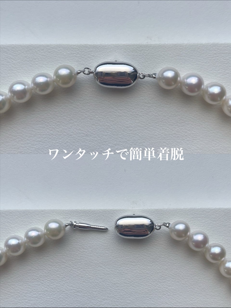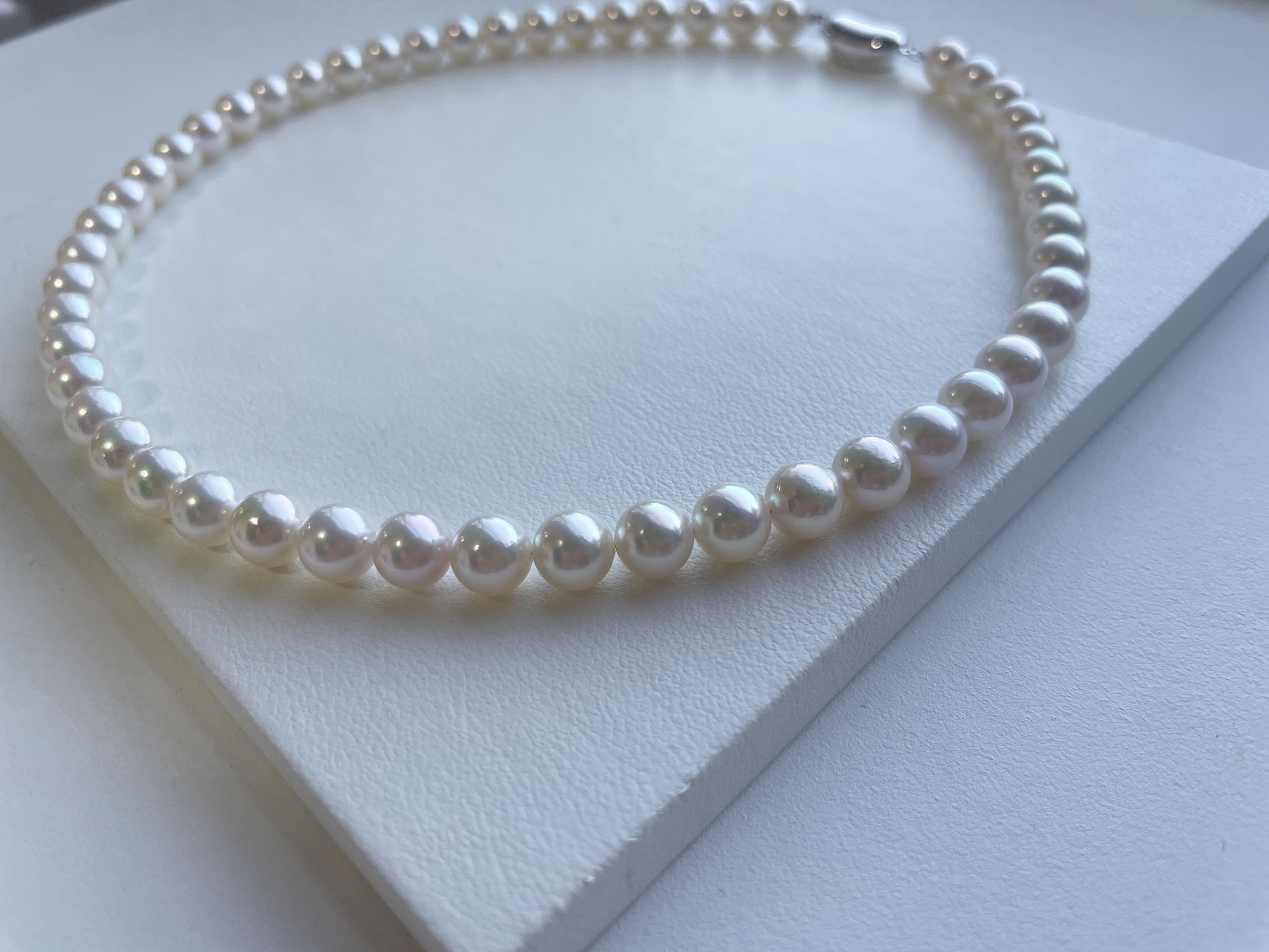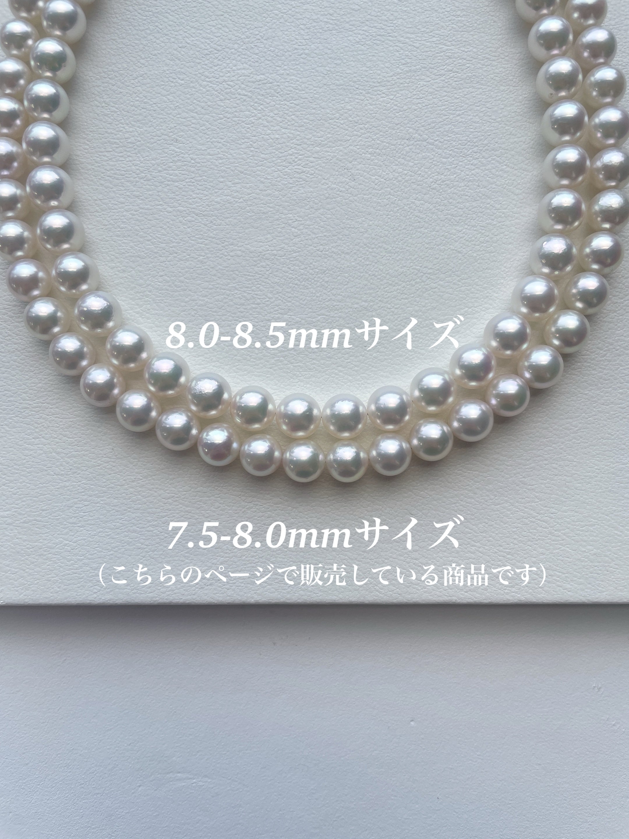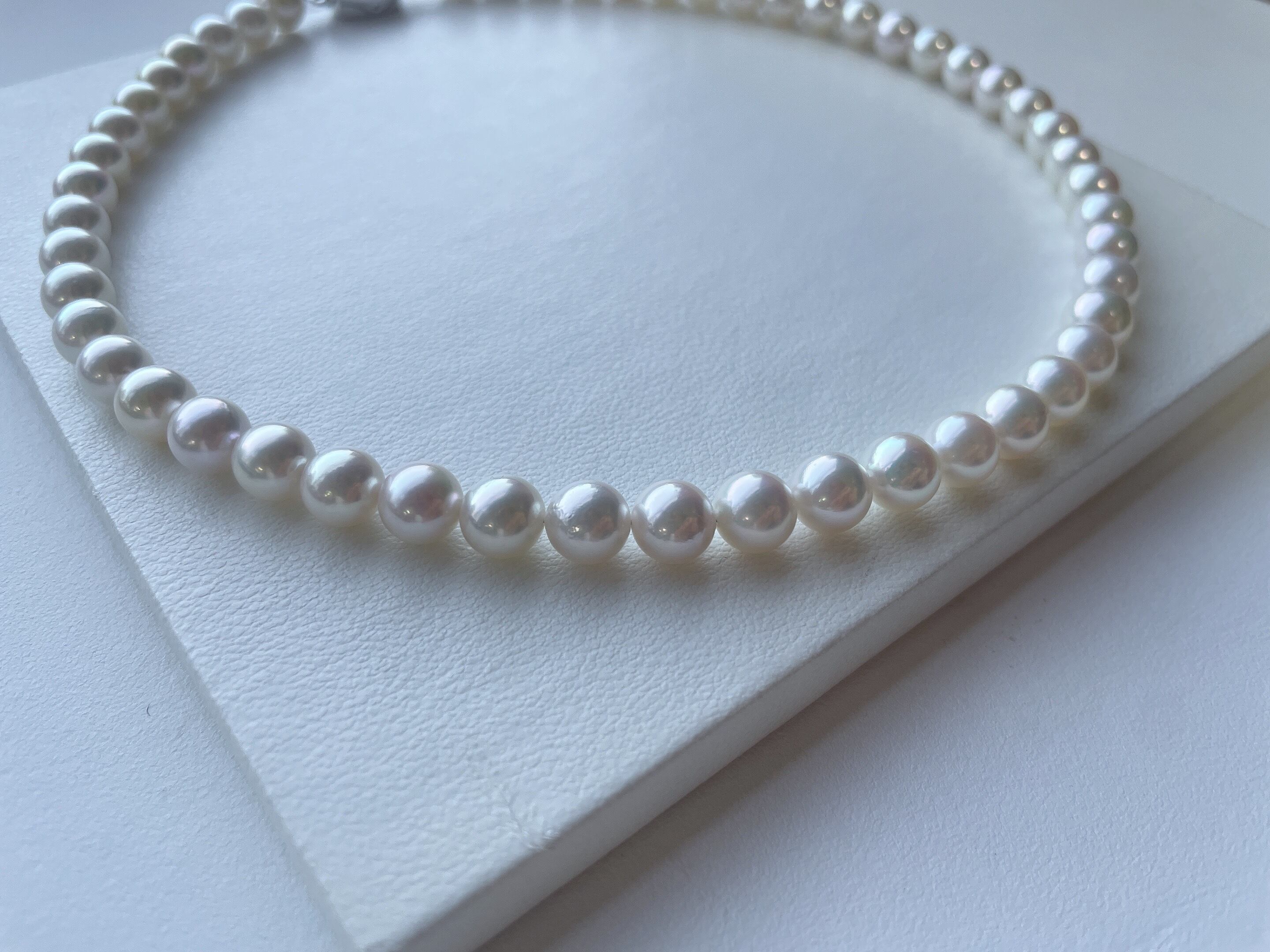 お顔周りをパッと明るくしてくれる、定番7.5mm~8mmアコヤ真珠ネックレス。