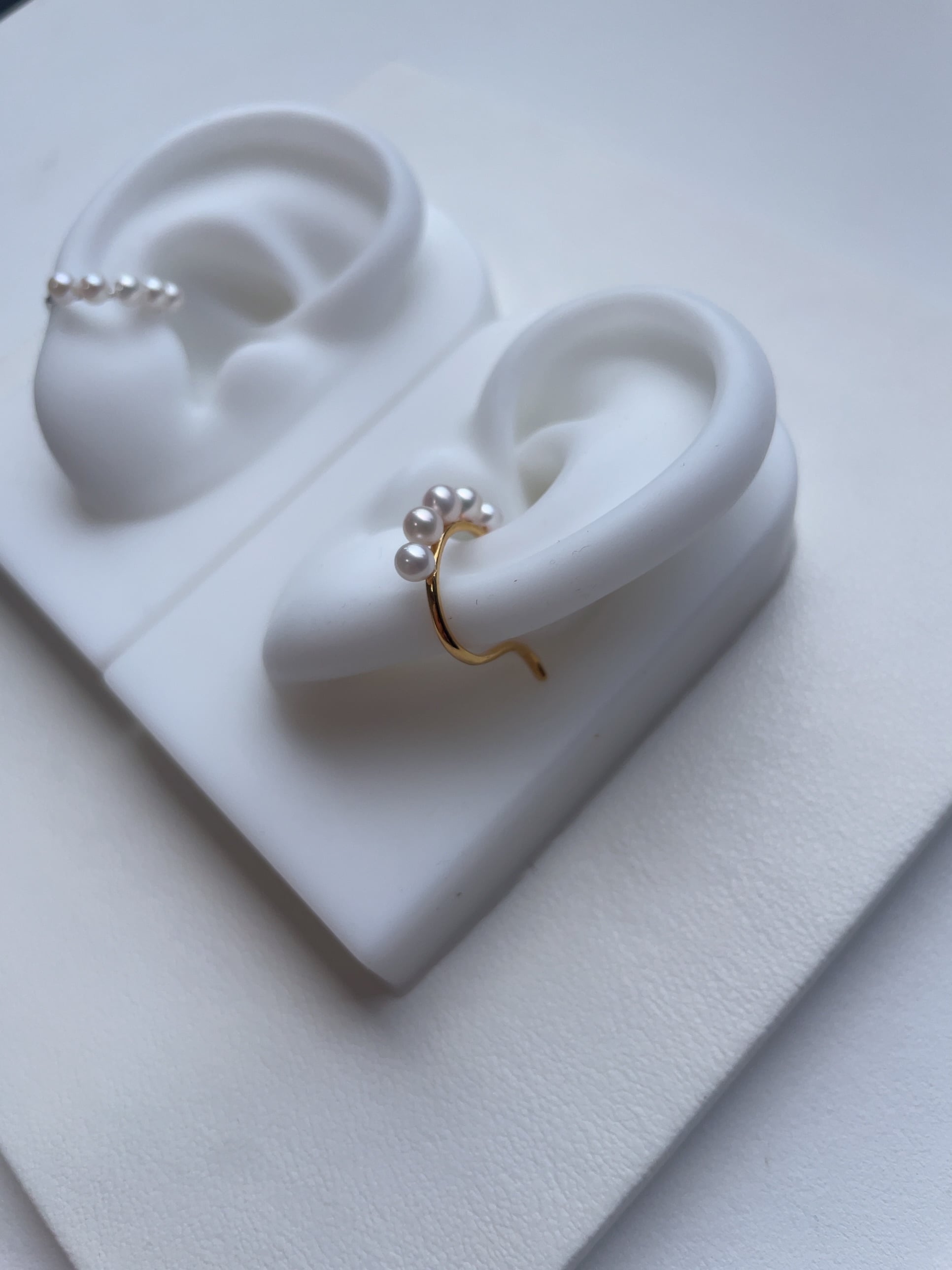 やさしく輝く5粒の淡水パールの片耳用イヤーカフです。