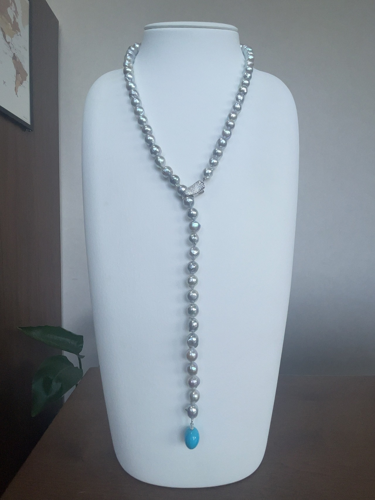 バロックのアコヤ真珠(ナチュラルグレー・約8.5mm)に、トルコ石を一粒合わせたネックレスです。