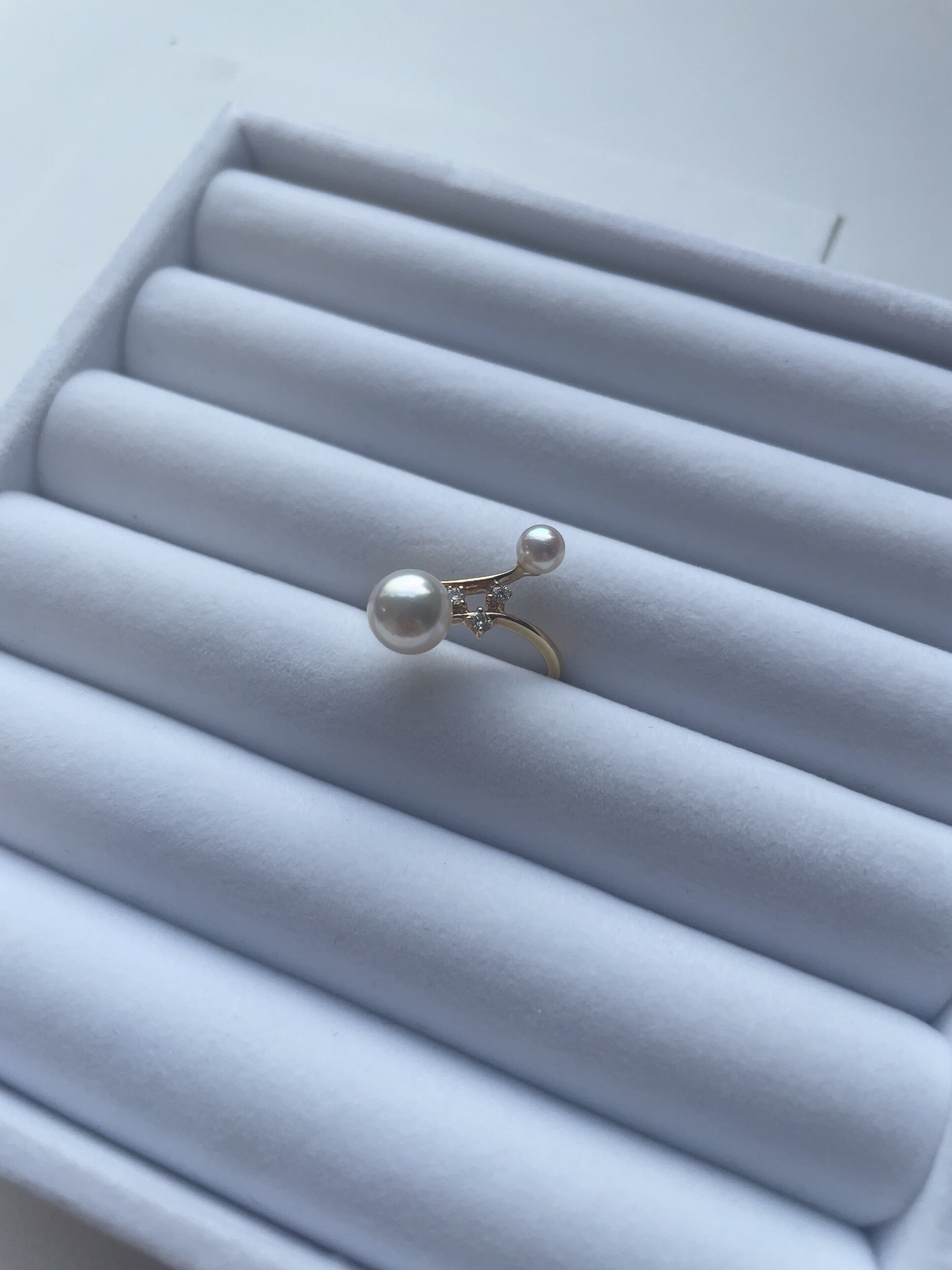大小2粒のアコヤ真珠(4〜6mm)が指元を優しく彩り、0.05ctのダイヤが洗練された輝きを添えます。