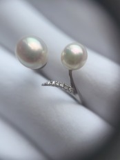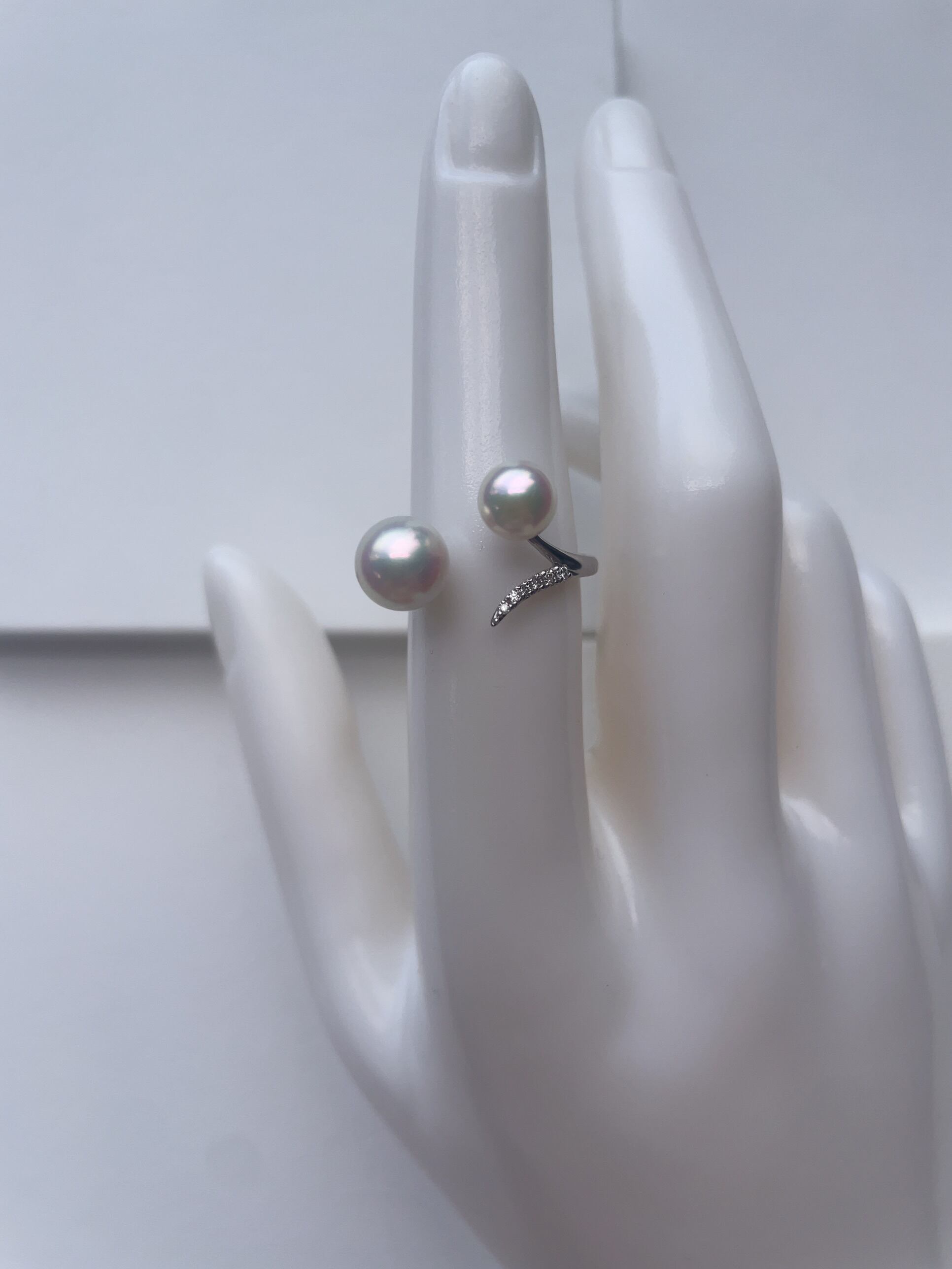 2粒のサイズ違いのアコヤ真珠が指先で上品に輝く、オープンデザインのリング。