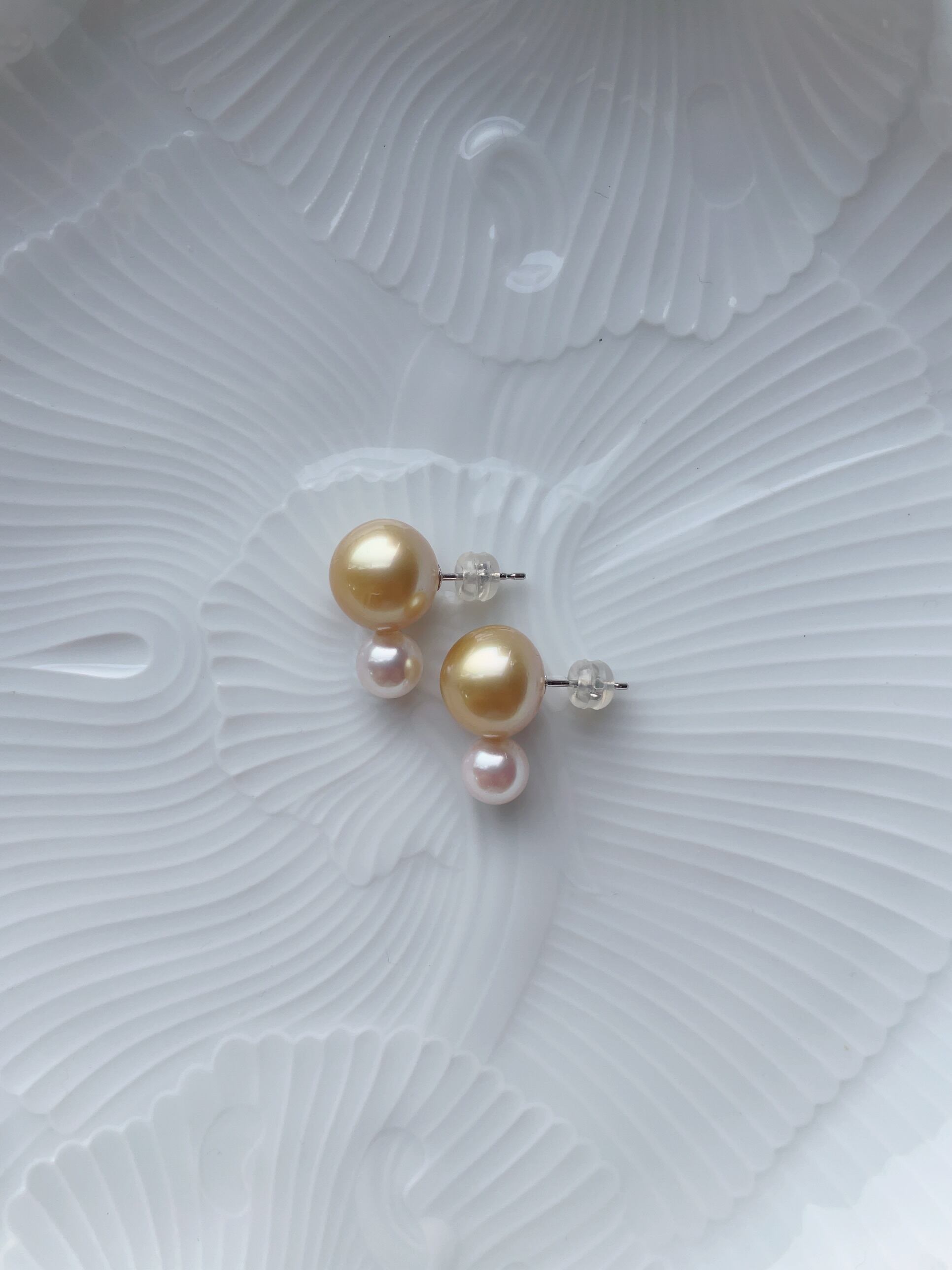パッと目を惹く、白蝶真珠とアコヤ真珠のスタッドピアス。