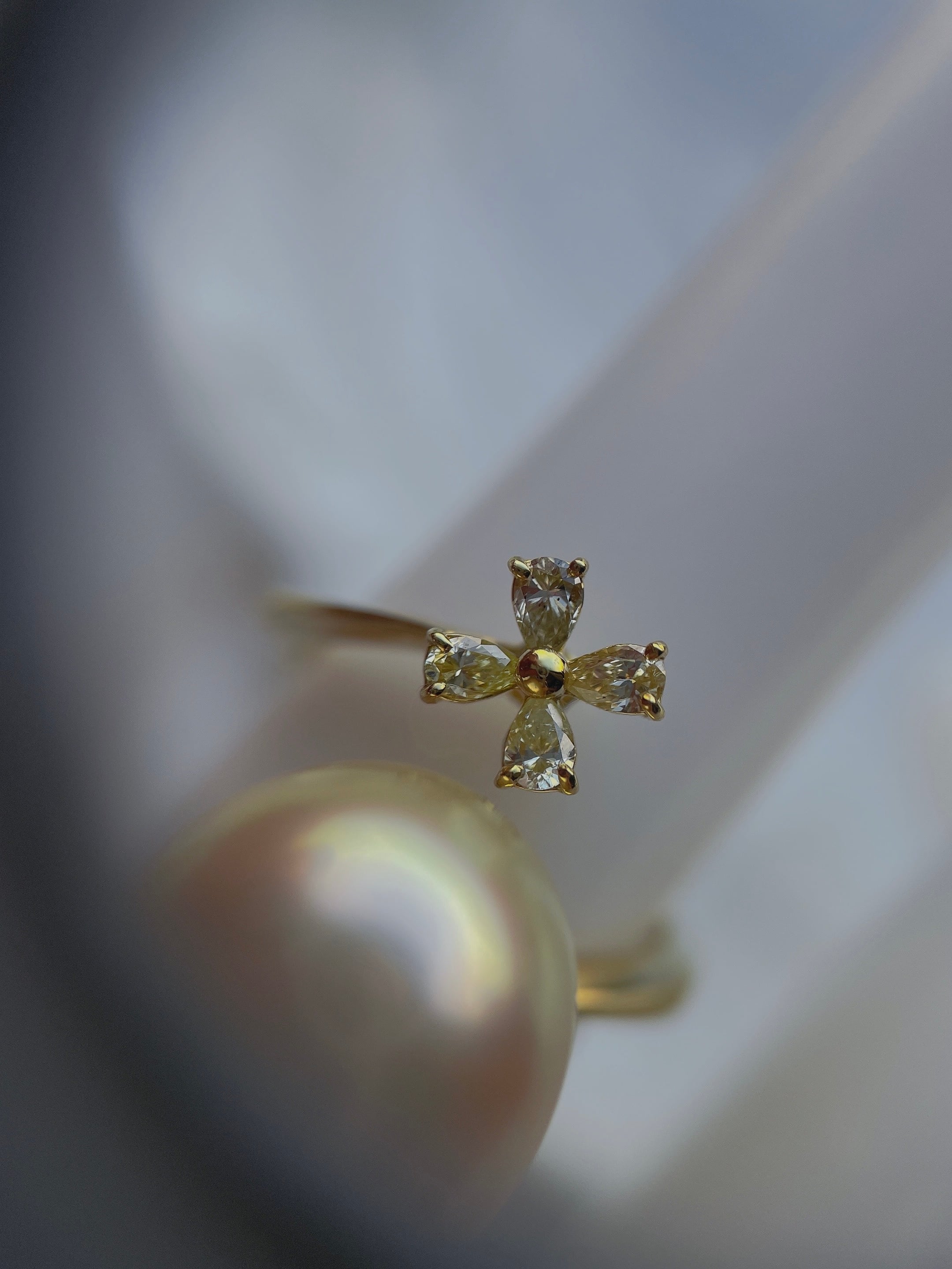 K18のアームに添えたダイヤモンドは、きらりと輝き、真珠の美しさを引き立てるアクセント。